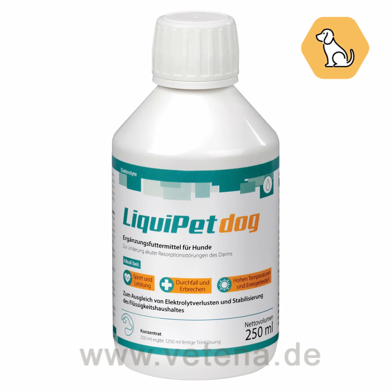 LiquiPet Dog ist ein Ergänzungsfuttermittel für Hunde, das speziell entwickelt wurde, um Elektrolytverluste auszugleichen und den Flüssigkeitshaushalt zu stabilisieren. Es ist ideal für Hunde, die unter starkem Wasserverlust leiden, einen erhöhten Energiebedarf haben, körperliche Höchstleistungen erbringen oder hohen Temperaturen ausgesetzt sind. Auch für ältere Hunde geeignet.