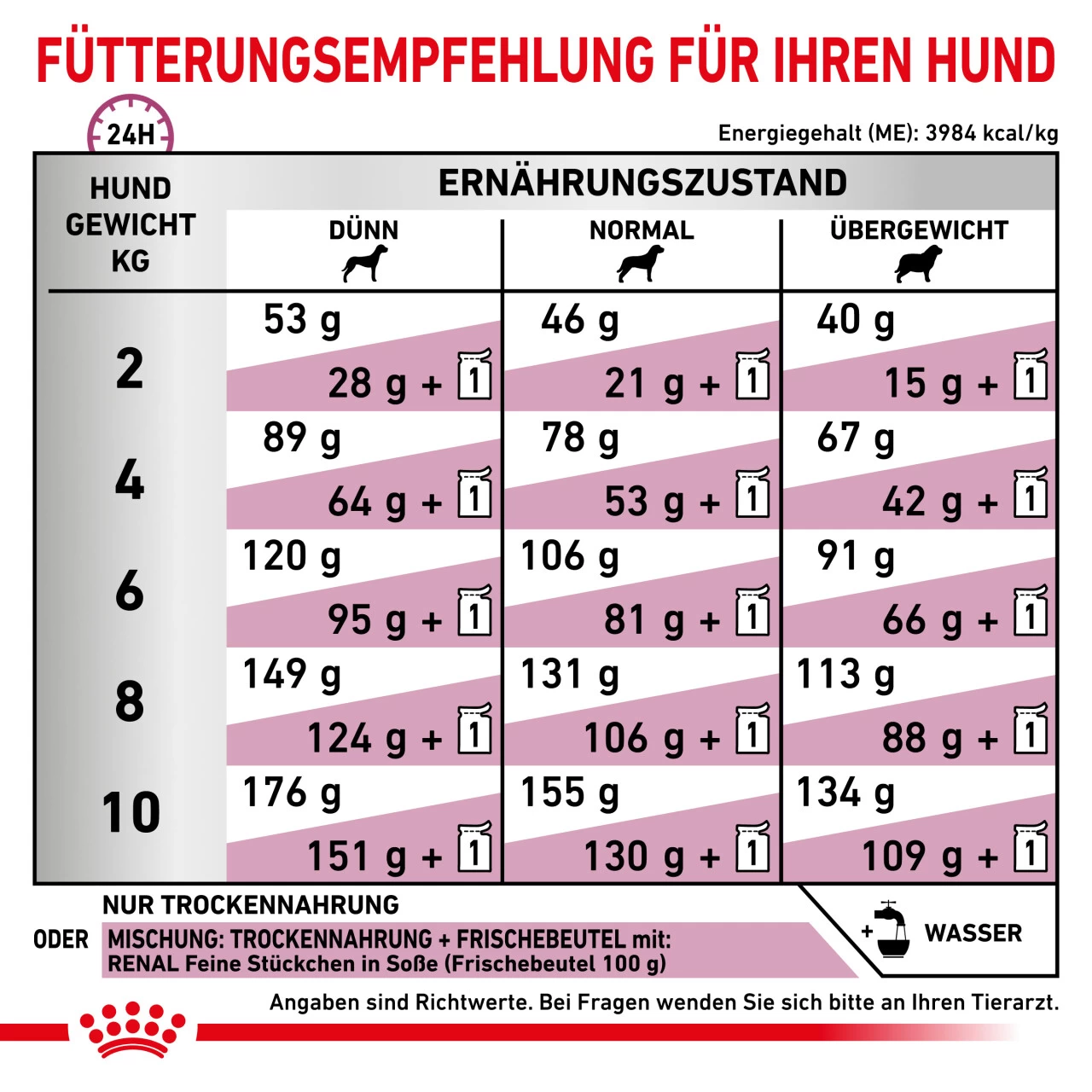 Bei diesem Produkt handelt es sich um eine tierärztliche Nahrung aus dem Sortiment Royal Canin Veterinary Diet für Hunde. Dementsprechend ist es wichtig, dass das Futter nur auf Empfehlung einer Tierärztin oder eines Tierarztes gefüttert wird. So kann sichergestellt werden, dass Ihr Tier genau die Nahrung erhält, die es wirklich benötigt. Eine Nahrungsumstellung sollte sorgfältig und schrittweise über einen Zeitraum von 7–10 Tagen erfolgen. Achten Sie auf die korrekte Portionsgröße – insbesondere bei Mischfütterung.